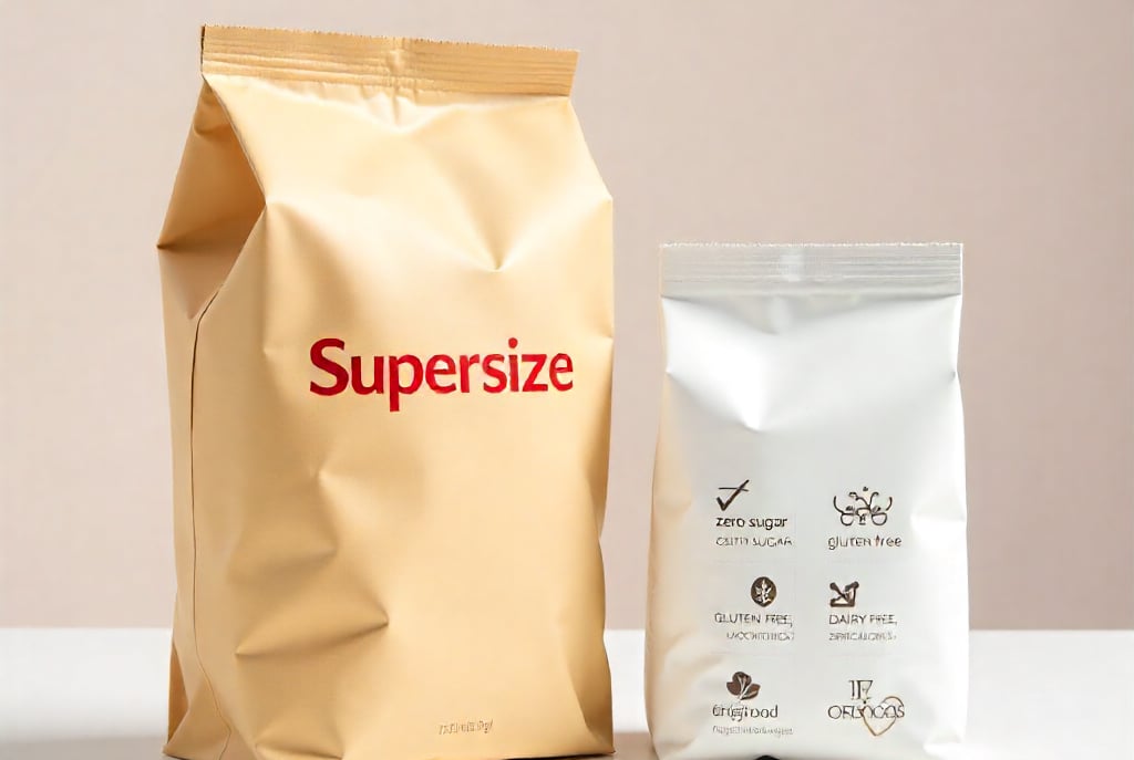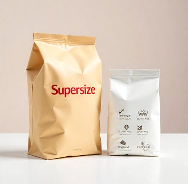 De um lado, encontramos versões cada vez maiores de produtos, com porções que ultrapassam em muito as necessidades do corpo. De outro, vemos embalagens que estampam declarações absolutas como “sem açúcar” ou “sem gordura”. Esses apelos soam sedutores porque parecem resolver o problema de forma simples: ou você pode comer à vontade, ou não pode comer de jeito nenhum.
